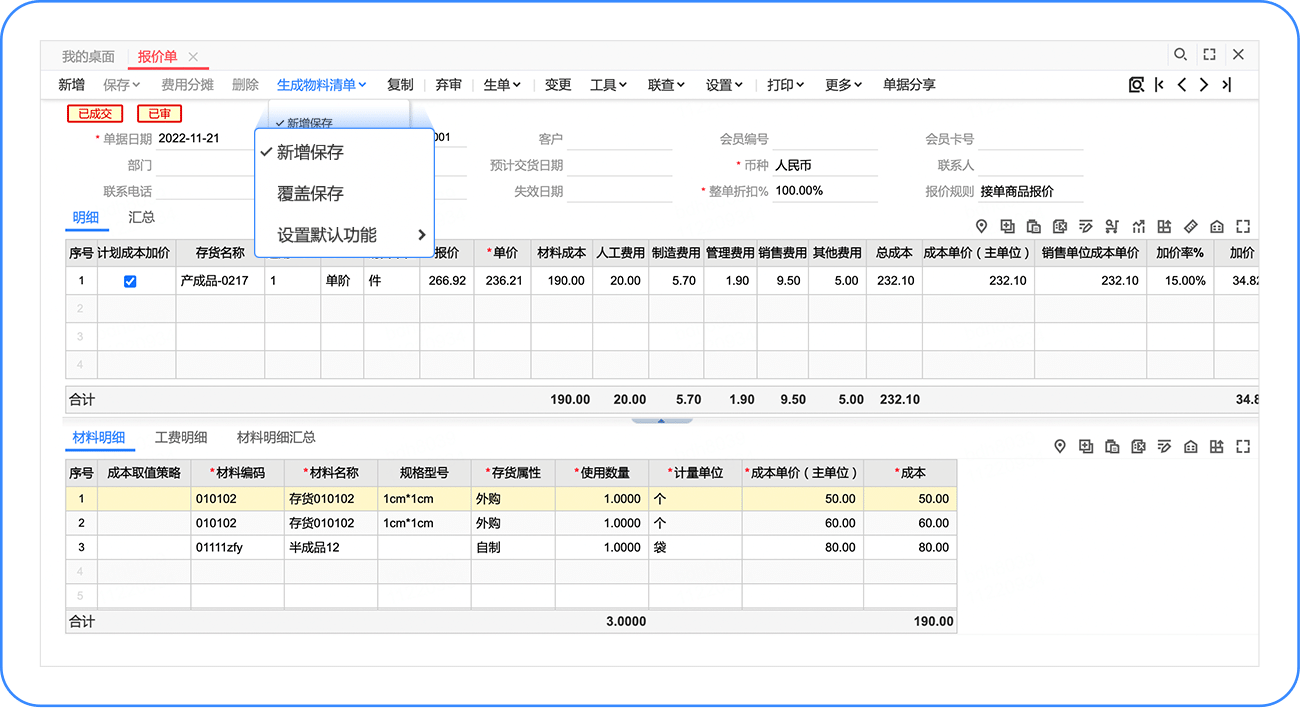 4)系统会根据【报价规则】中设置的料、工、费的取值策略,计算成本信息。即:总成本=材料成本合计+工费成本合计+制造费用+管理费+销售费+其他费用。