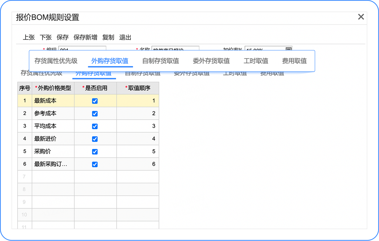 在基础档案中,找到【报价BOM规则设置】的档案,按照需求设置材料、工序(如已购买)、费用等取数方式和优先级,用于报价中核算成品的料、工、费的成本,计算成品的销售报价。